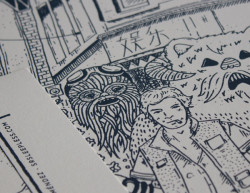 El juego consiste en emparejar a los personajes con sus nombres, así que, ni corta ni perezosa, se cogió un libro antiguo de esos que tienen los padres en las estanterías y que nadie lee, lo hizo trozos, les quemó el borde para darle un aire más solemne y se puso a escribir nombres y dibujar sobre ellos personajes de La Guerra de las Galaxias. Su padre se quedó tan sorprendido con el resultado, que hizo esta sesión y ha empezado a moverlo por la red.